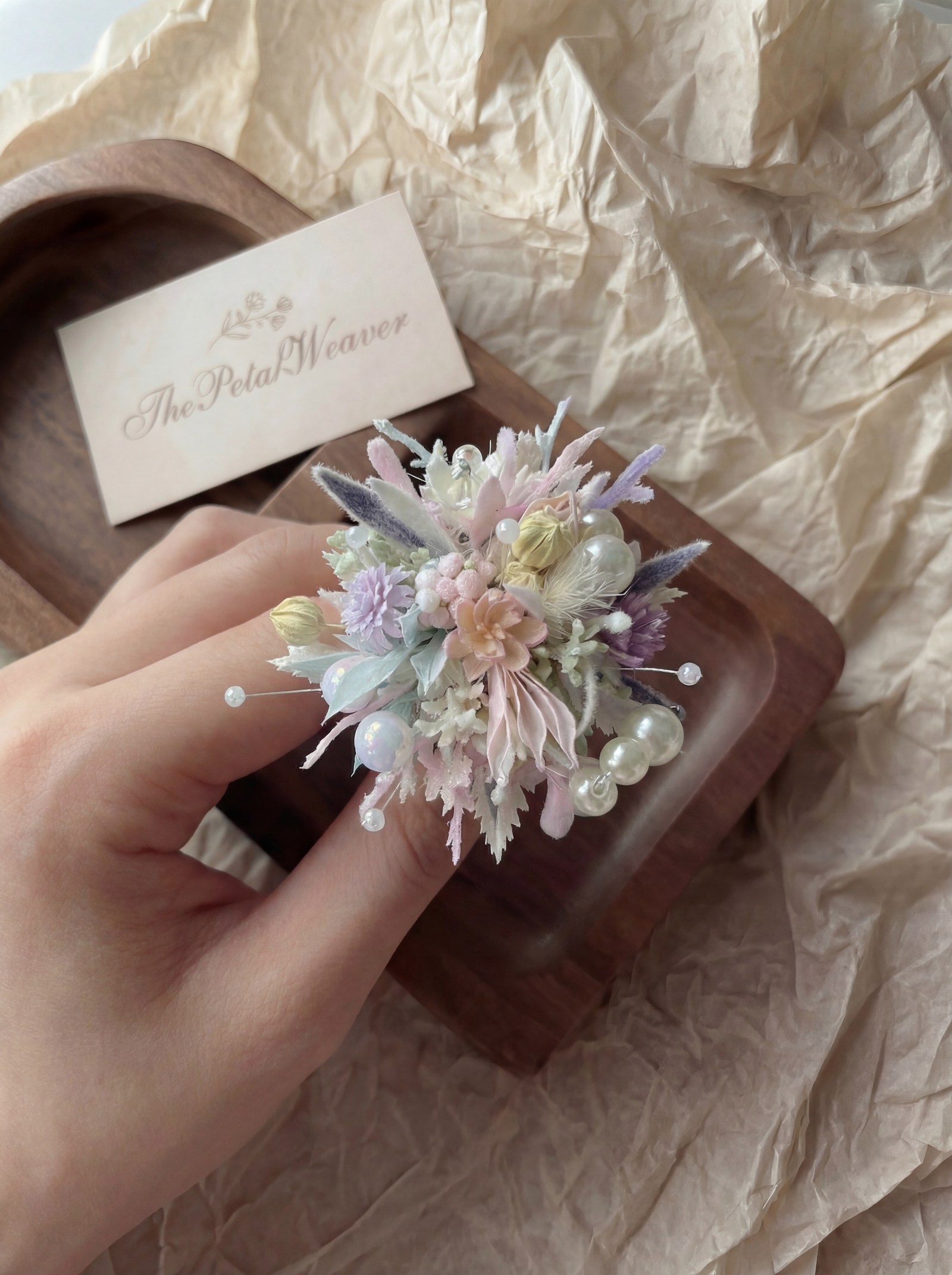 Preserved pastel petals cluster with luminous pearls—like gardenias kissed by moonbeams.